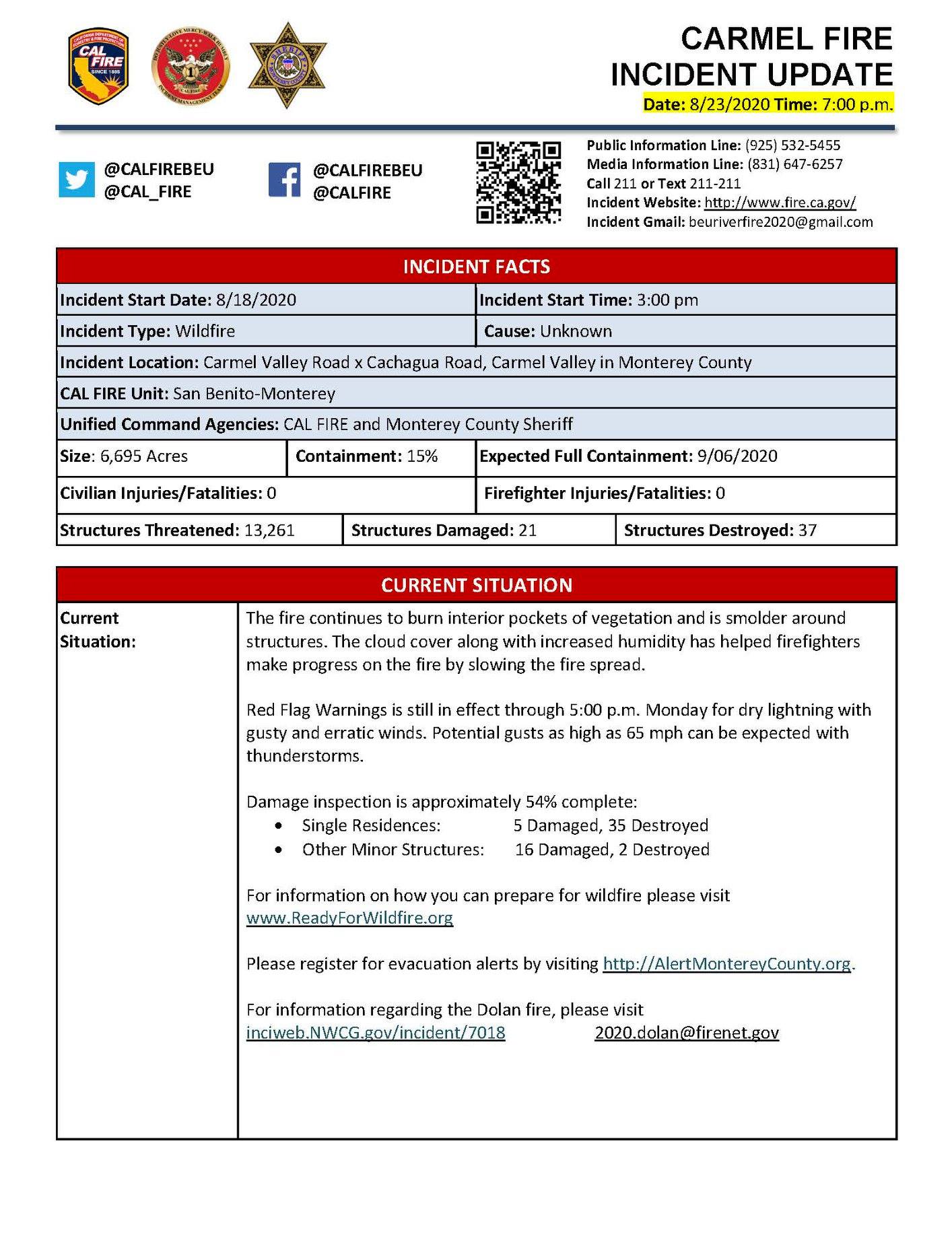Carmel: 6,695 acres 15% contained, 909 personnel assigned, 5 residences damaged, 35 residences destroyed, 16 minor structures damaged, 2 minor structures destroyed, damage inspection 54% complete, delivered over 197,000 gallons of water and over 9,000 gallons of fire retardant.