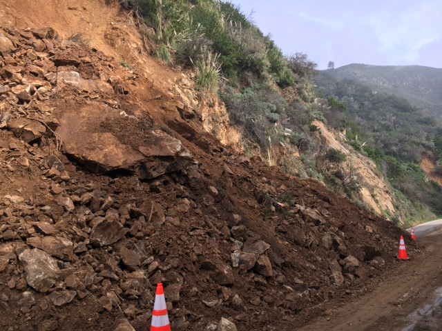 State Route 1 CONTINUES closed from Ragged Point (SLO PM 72.87) to Anderson Canyon Bridge (MON PM 35.4) due to rock/mudslides in multiple locations. The newest slide is located at PM 35, requiring the closure to move from Lucia (PM 23) to Anderson Canyon Bridge (PM 35.4).